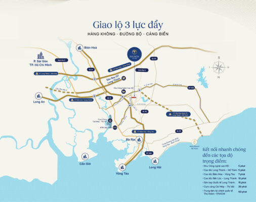Từ dự án, cư dân mất 5-15 phút để tiếp cận tuyến đường quan trọng gồm cao tốc Biên Hòa – Vũng Tàu, cao tốc Bến Lức – Long Thành, cao tốc Long Thành – Hồ Tràm, Vành đai 4.
